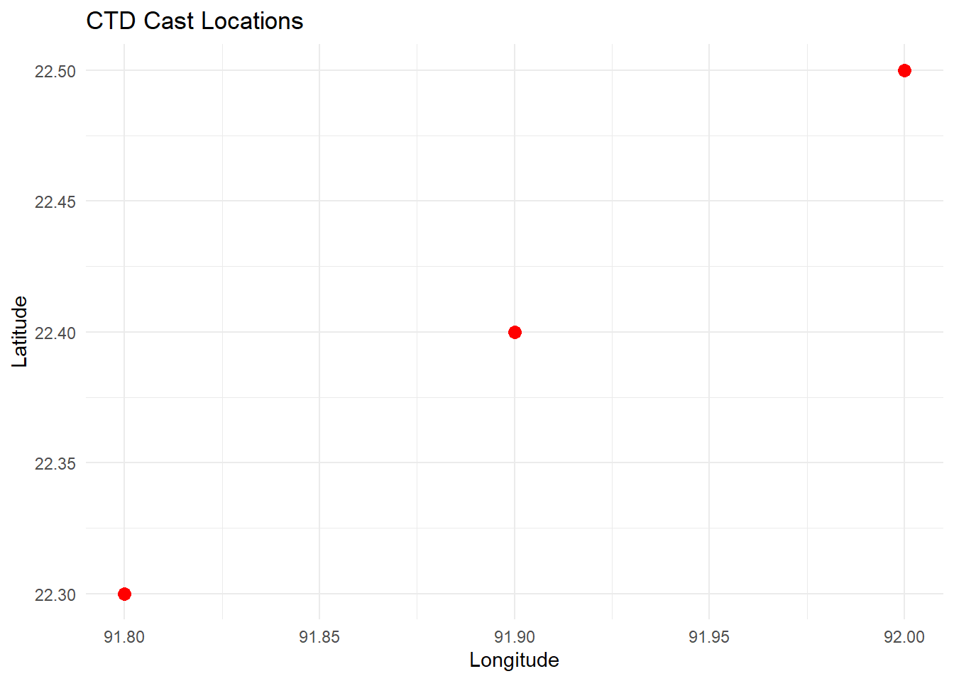 If you have multiple CTD casts with geographic coordinates, you can map their locations. Assuming you have a data frame ctd_locations with longitude and latitude:β