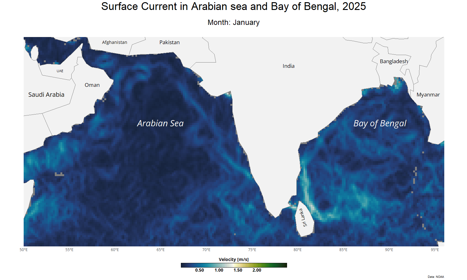 This map displays the surface currents of the Bay of Bengal (BOB) and Arabian Sea (AS) for 2025, derived from Near Real-Time Geostrophic Currents data by NOAA