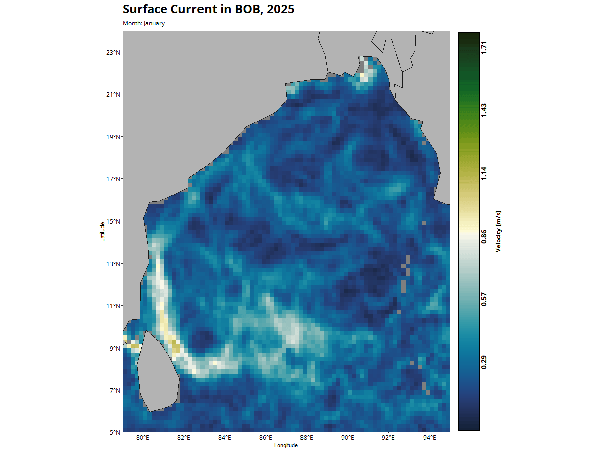 This map displays the surface currents of the Bay of Bengal (BOB) for 2025, derived from Near Real-Time Geostrophic Currents data. The dataset is provided by NOAA’s CoastWatch Caribbean and Atlantic Oceanographic and Meteorological Laboratory (AOML) and has been publicly available since 2016. It offers global ocean current information at a spatial resolution of 0.2° (~22 km).
